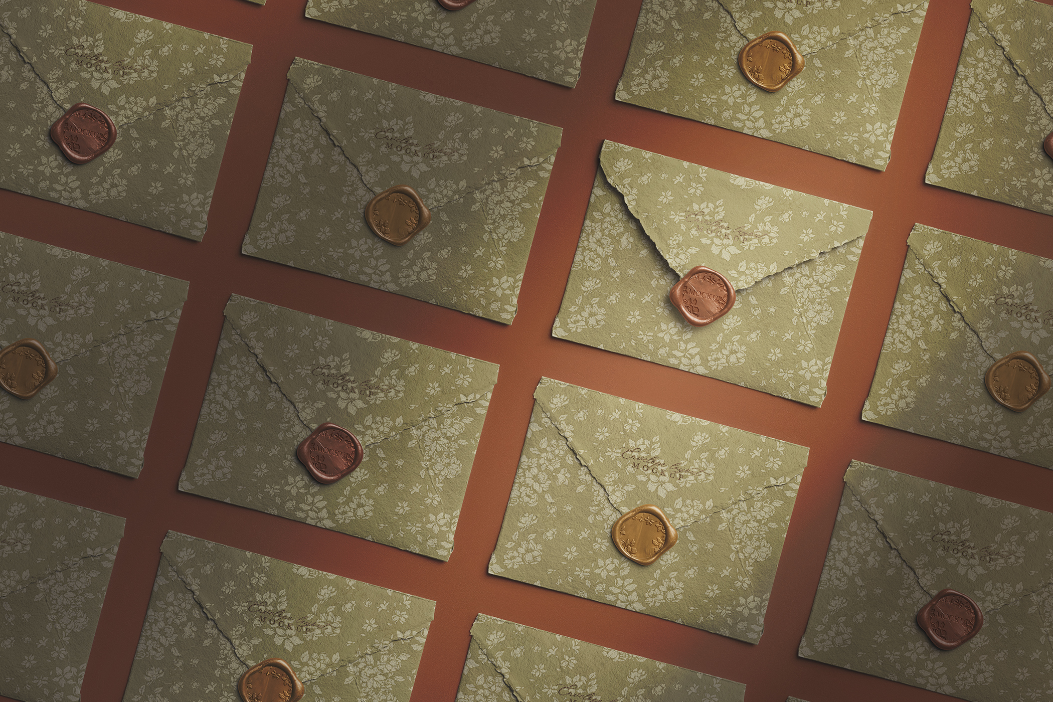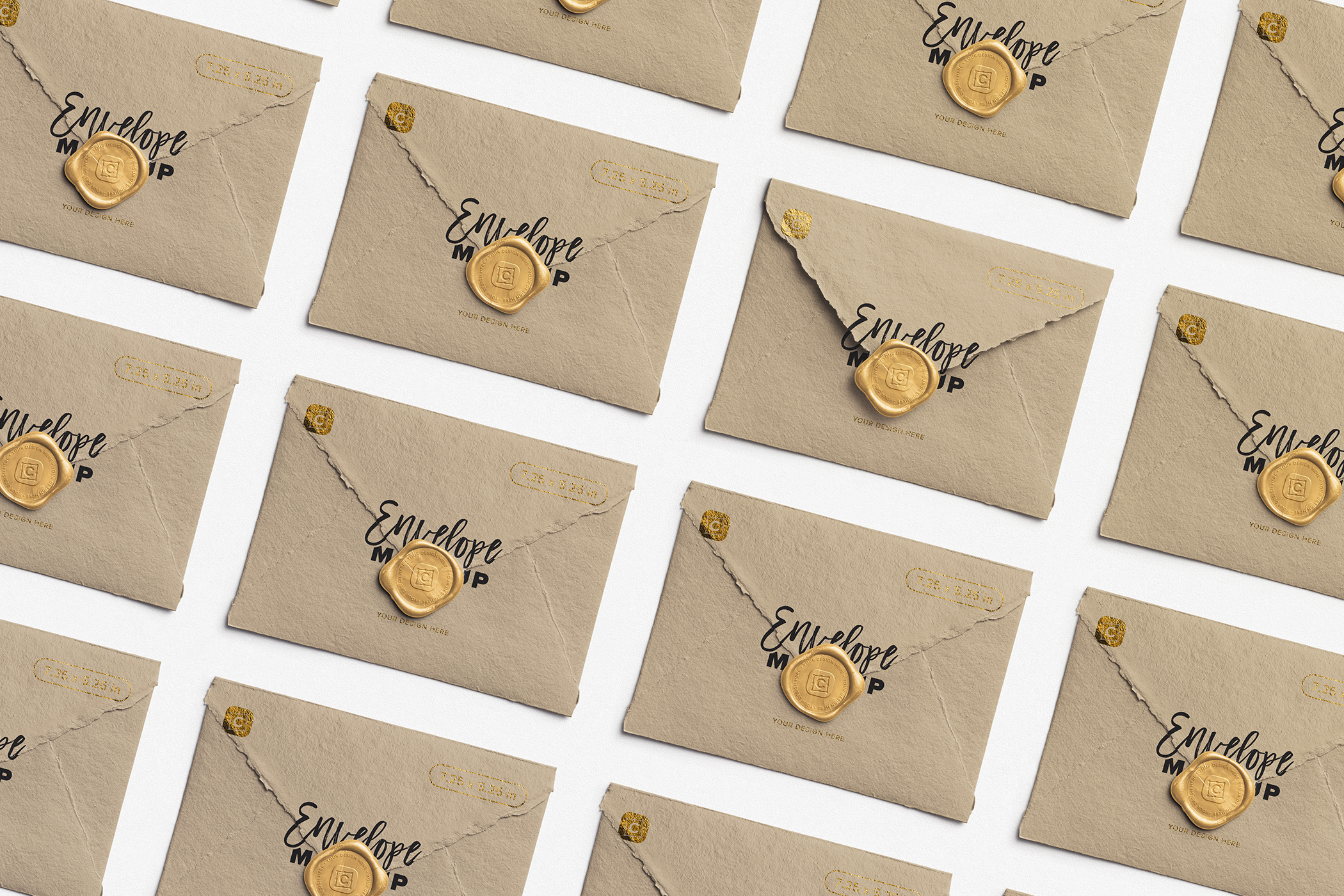 Blend rustic charm with refined presentation using the Wax Seal on Handmade Envelope Layout Mockup. Created for wedding brands, handmade stationery sellers, and small creative businesses, this mockup lets you display your envelope and seal designs in a cohesive, repeating layout—perfect for showcasing custom stationery, invitations, or branding collections.