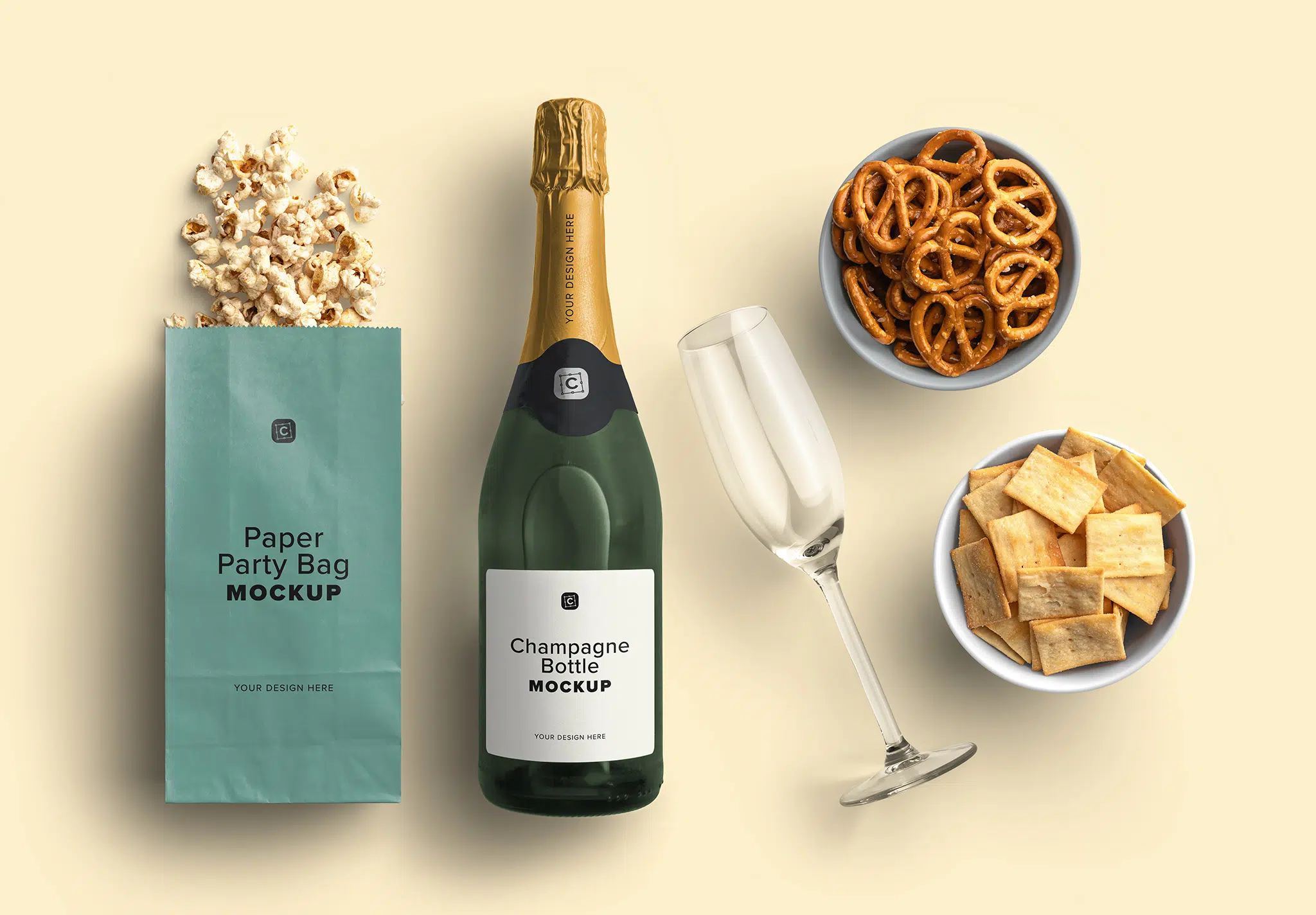 - Snacks and Champagne Elements: Pretzels, Champagne Bottle and Glass, Popcorn, Party Bags, and Snacks.