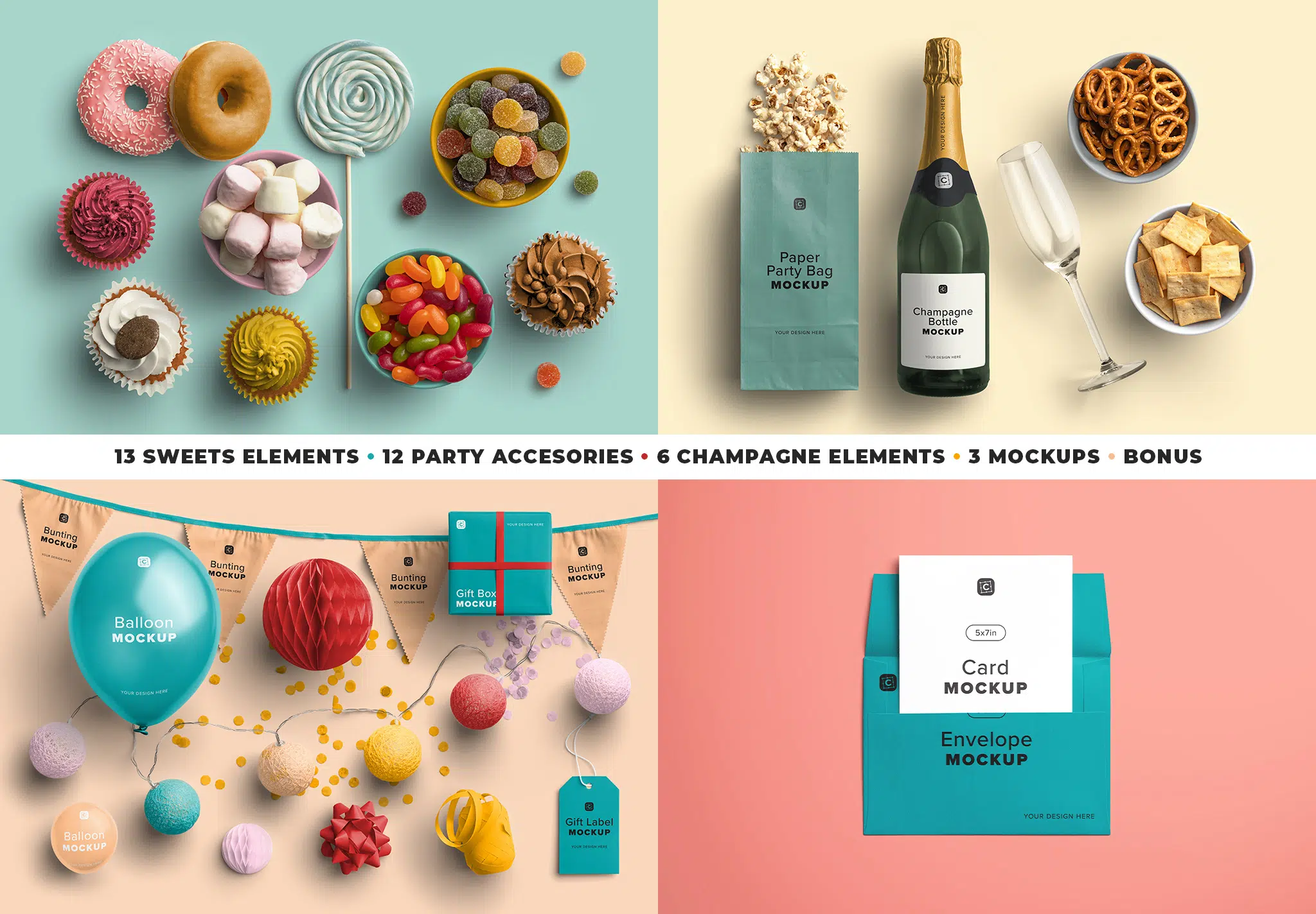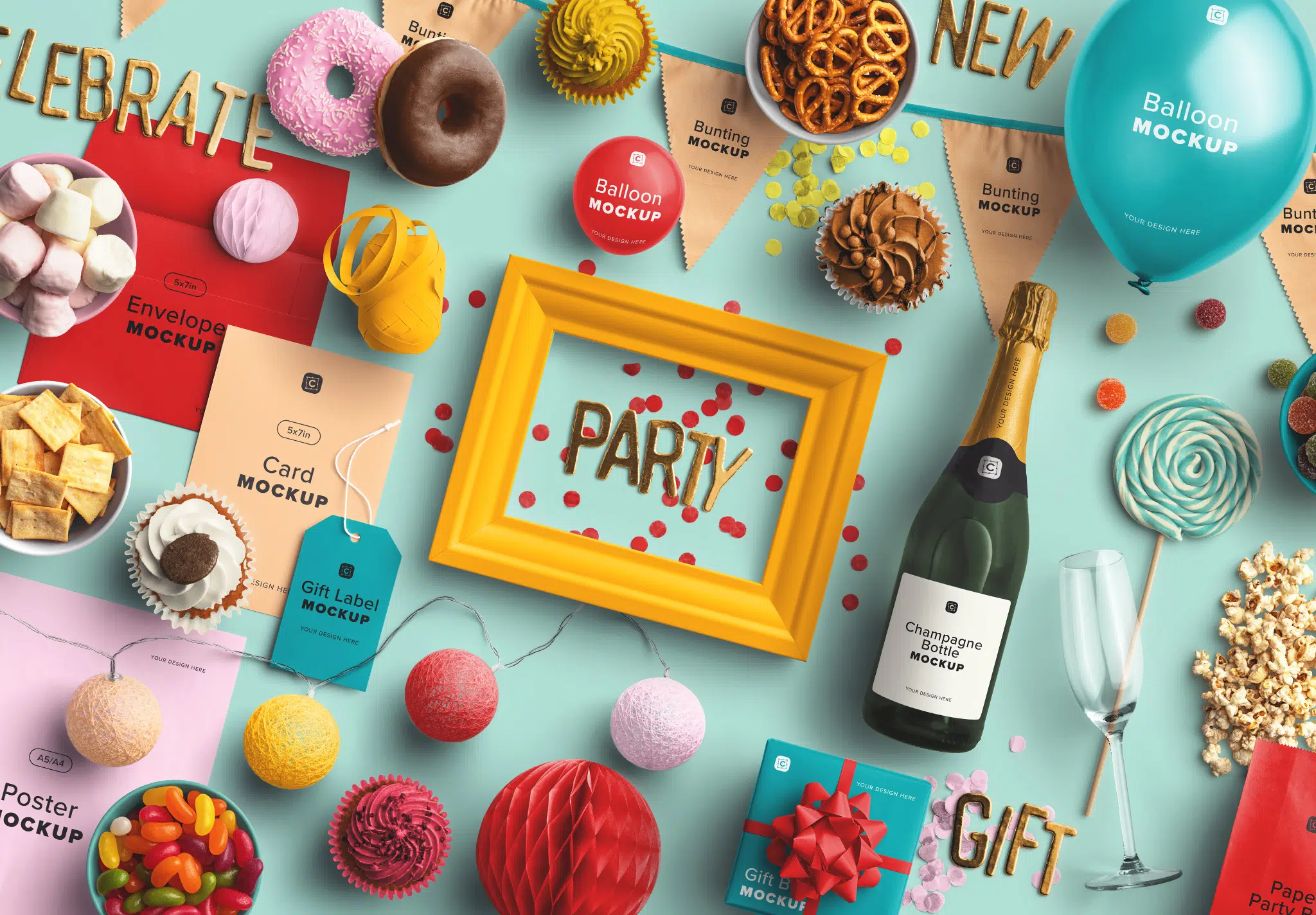 - Party Mockups: 5x7inch Card Mockup, Frame Mockup, and Poster Mockup.